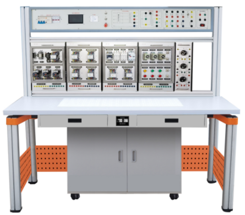 掛箱上已安裝有熔斷器、鈕子開關、交流接觸器、時間繼電器、直流接觸器、按鈕開關、信號指示燈、熱繼電器等,所有器件均采用國內知名品牌。各種實訓元器件的接線都在接線端子排上進行接線,避免了因長期在器件本身進行螺絲拆裝而導致元器件的損耗,通過走線槽走線,進行工藝布線訓練。實訓電路與裝置電源的連接通過安全插座和高可靠護套結構手槍插連接線,安全快捷。