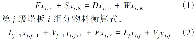式中:F、S、D 和W 分別為進料量、萃取劑量、精餾塔頂采出量和塔底采出量,kg /h; Lj和Vj分別為第j 塊塔板的液相和氣相流量,kg /h;xi,j和為yi,j分別是第j 塊塔板或j 類液相和氣相中i 組分的質量分率;當j 為非進料級時,F=0。