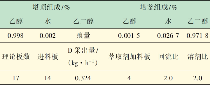 汽液相平衡關系是萃取精餾模擬設計的基礎,考慮物系中各組分均為極性化合物,選用預測精度較高的活度系數模型。本設計選擇Wilson、NRTL和UNIQUAC模型預測乙醇-水二元體系汽液相平衡,三類模型預測結果與實驗值均保持較好的一致;但對共沸溫度和共沸點組成,Wilson模型預測誤差較大,UNIQUAC模型結果與實驗值相差最小,這一預測結果與文獻數據基本保持一致。另外,UNIQUAC預測發(fā)現乙二醇-水汽液相平衡線偏離y=x線很大,表明乙二醇萃取劑回收流程較為簡易,實驗中可通過萃取精餾塔流程改造來實現萃取劑回收操作。