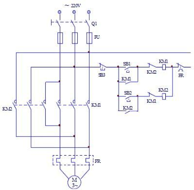 (3)按反向起動(dòng)按鈕SB2,電動(dòng)機(jī)反向起動(dòng),觀察電動(dòng)機(jī)的轉(zhuǎn)向及接觸器的動(dòng)作情況。按停止按鈕SB3,使電動(dòng)機(jī)停轉(zhuǎn)。