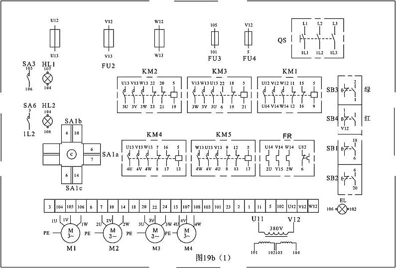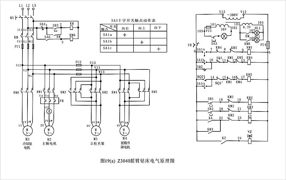 (1) 主電路分析 本機床的電源開關(guān)采用接觸器KM,具有零壓保護和欠壓保護作用。從圖19(a)中可看出,搖臂鉆床共有四臺電動機。主電動機M2由主接觸器KM1控制,單向旋轉(zhuǎn),主軸正反轉(zhuǎn)由機械手柄操作。電動機M3是立柱放松和夾緊電動機。用接觸器KM2和KM3控制。M4是搖臂升降電動機,用接觸器KM4和KM5控制。M1是冷卻泵電動機。