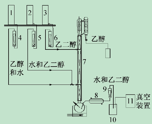1,2,3-高位槽,4,5,6,9-轉子流量計,7-三段式萃取精餾塔,8-冷卻器,10-產品罐,11-真空裝置